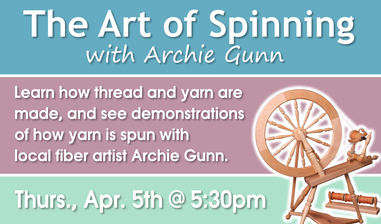 The Art of Spinning Thursday, April 5, 2018 5:30 PM 6:45 PM 17:30 18:45 Google Calendar ICS This event will take place in the Library Auditorium.