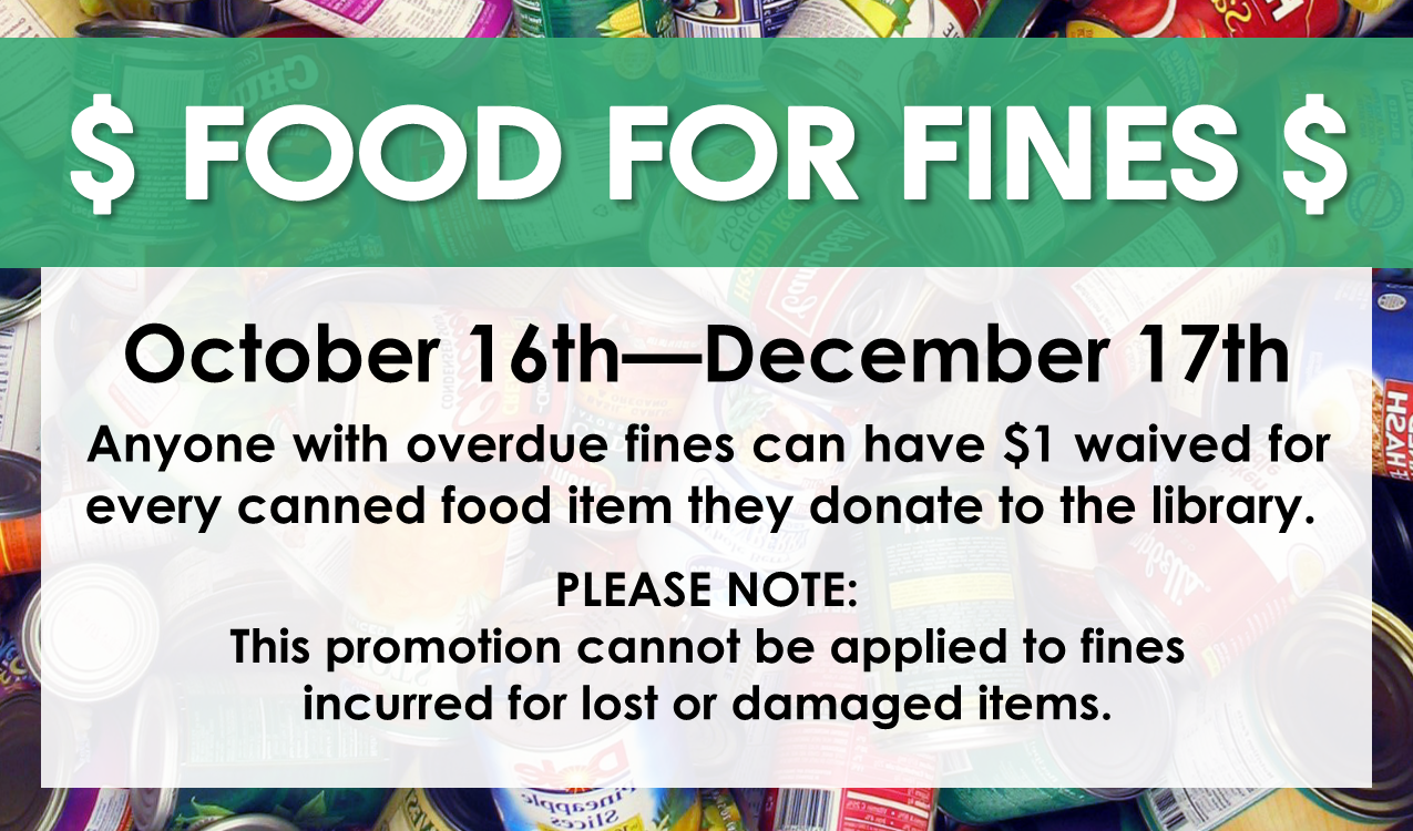 Anyone with overdue fines can have $1 waived for every canned food item they donate to the library. All food will be donated to a local food pantry. The event will end December 17th.