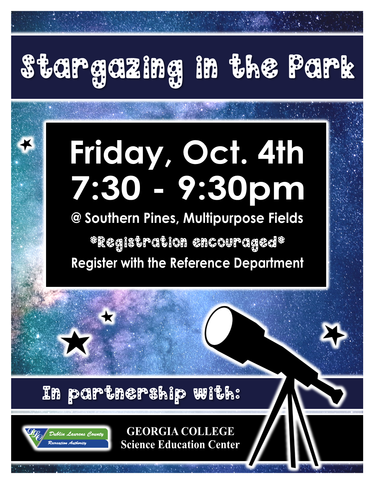 View the night sky with us at Southern Pines, Multipurpose Fields. In partnership with DLCRA and GCSU Science Education Center.