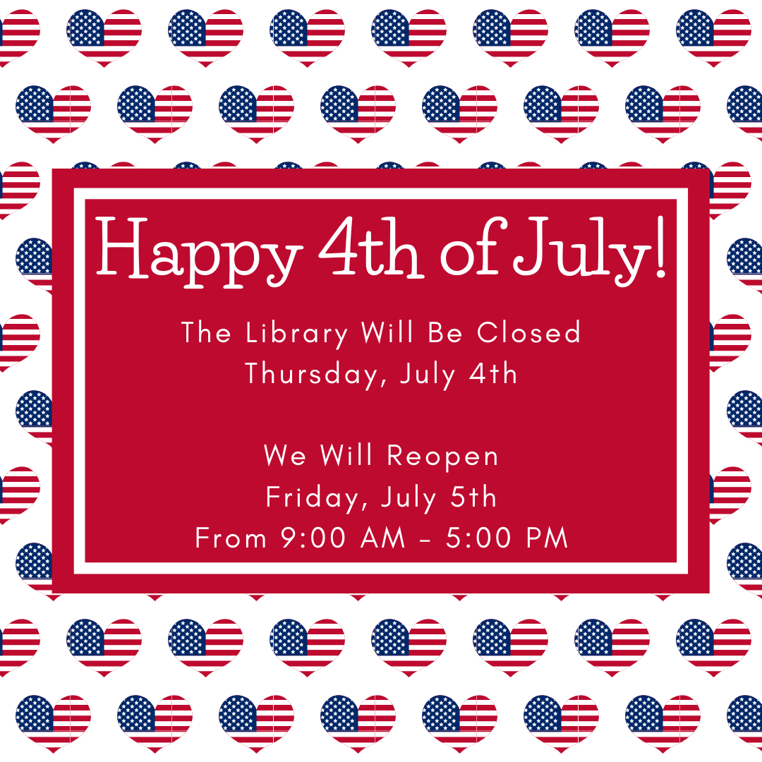 Library Closed for Independence Day Thursday, July 4, 2024 12:00 AM 11:59 PM 00:00 23:59 Google Calendar ICS
