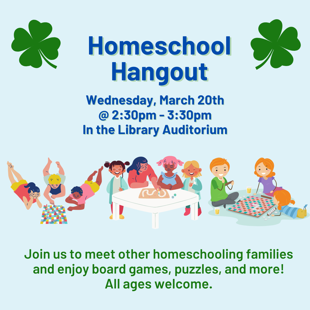 Homeschool Hangout Wednesday, March 20, 2024 2:30 PM 3:30 PM 14:30 15:30 Laurens County Library 801 Bellevue Avenue Dublin, GA, 31021 United States (map) Google Calendar ICS