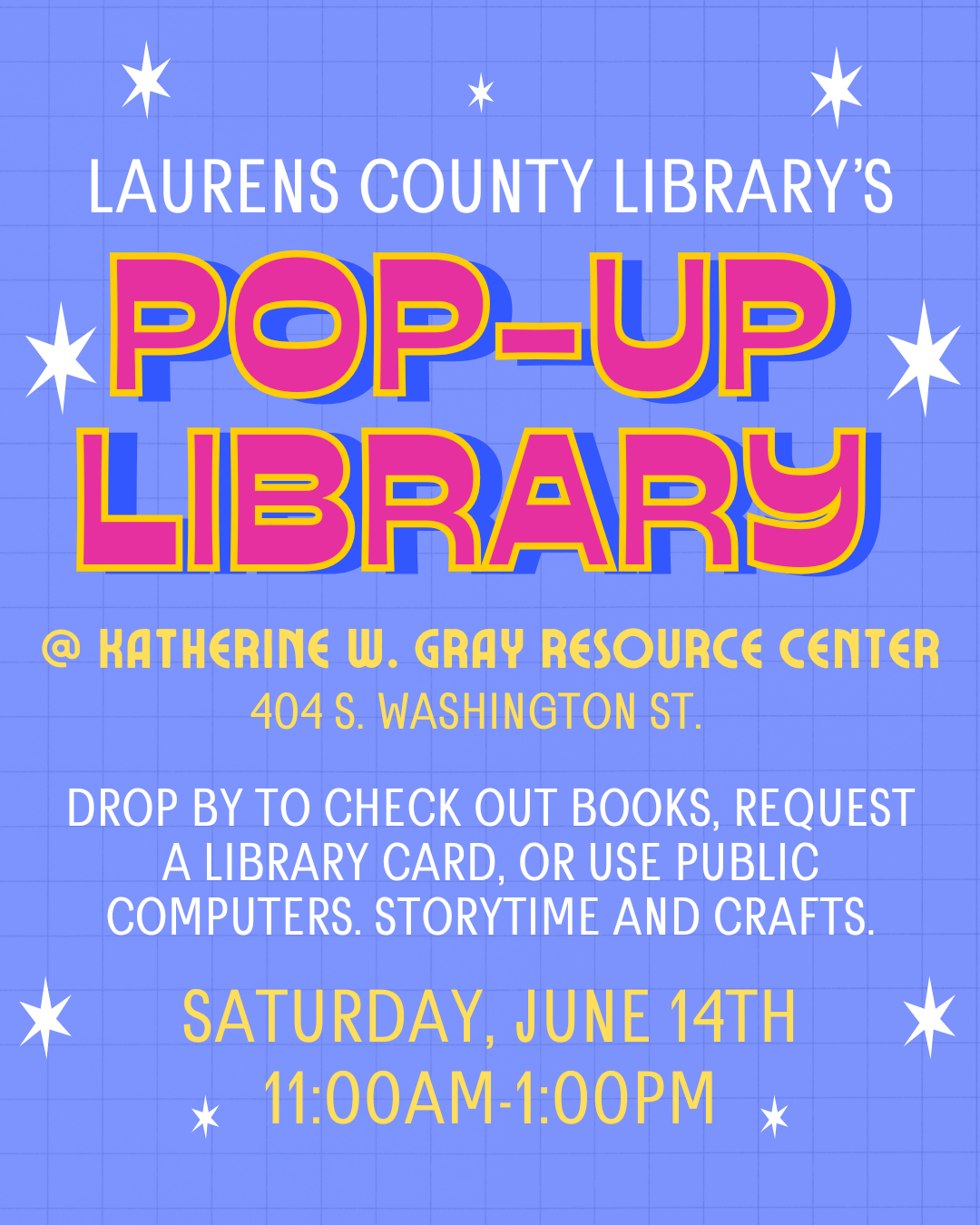 Drop by to check out books, request a library card, or use public computers. Storytime and crafts.