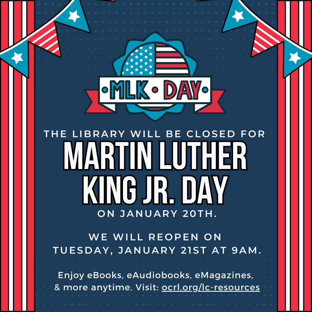The Library will be Closed for Martin Luther King Jr. Day. We will reopen Tuesday, Jan. 21st @ 9:00AM.