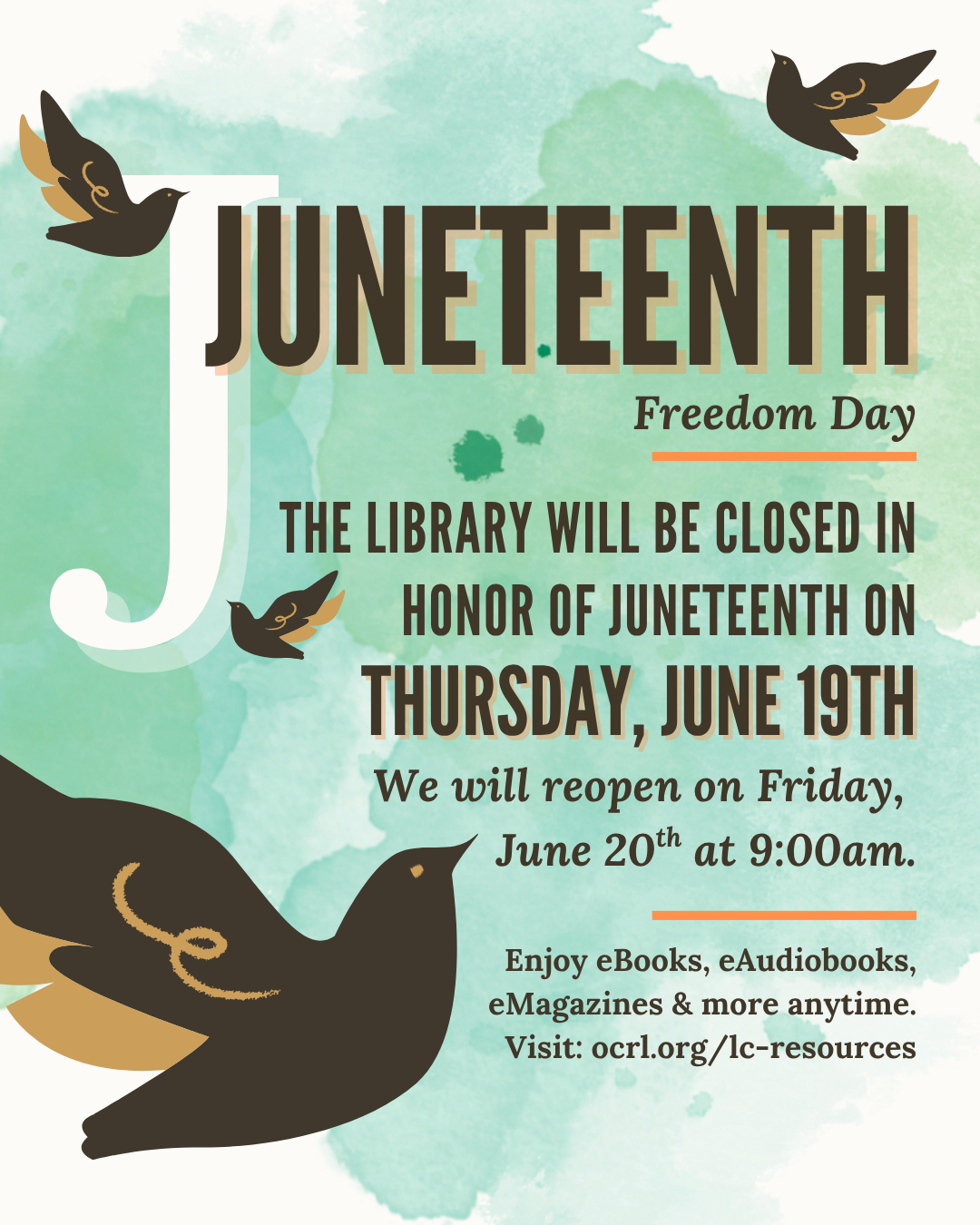 Enjoy eBooks, eAudiobooks, eMagazines, & more anytime. Visit: ocrl.org/lc-resources