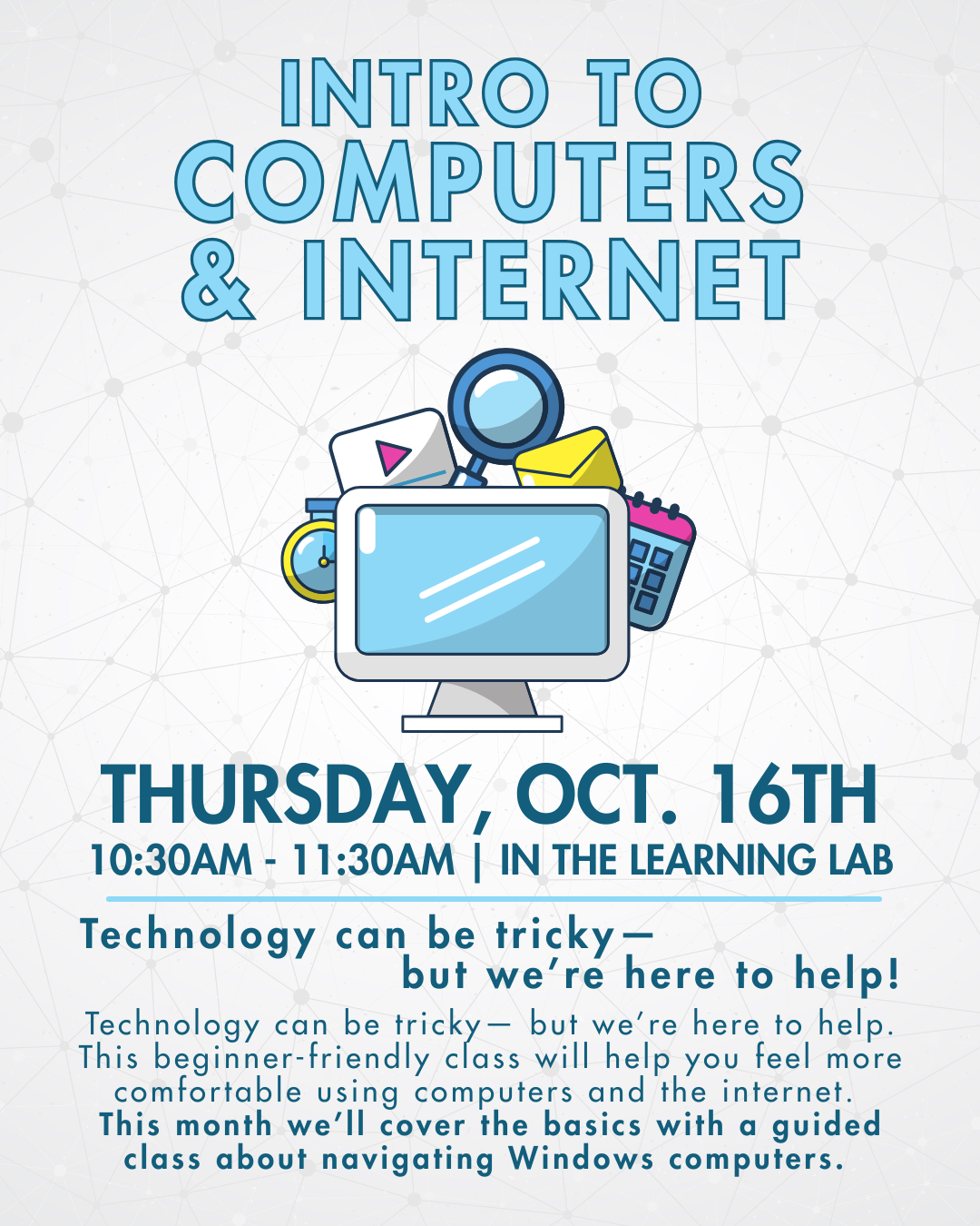 Technology can be tricky— but we’re here to help. This beginner-friendly class will help you feel more comfortable using computers and the internet. This month we’ll cover the basics with a guided class about navigating Windows computers.