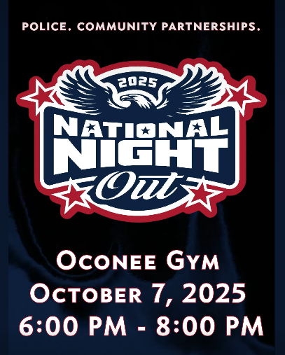 National Night Out @ Oconee Gym Tuesday, October 7, 2025 6:00 PM 8:00 PM 18:00 20:00 Oconee Gym 525 Charles W. Manning Sr. Wy Dublin, GA 31021 United States (map) Google Calendar ICS Join us for this annual community-building campaign that promotes police-community partnerships and neighborhood camaraderie.