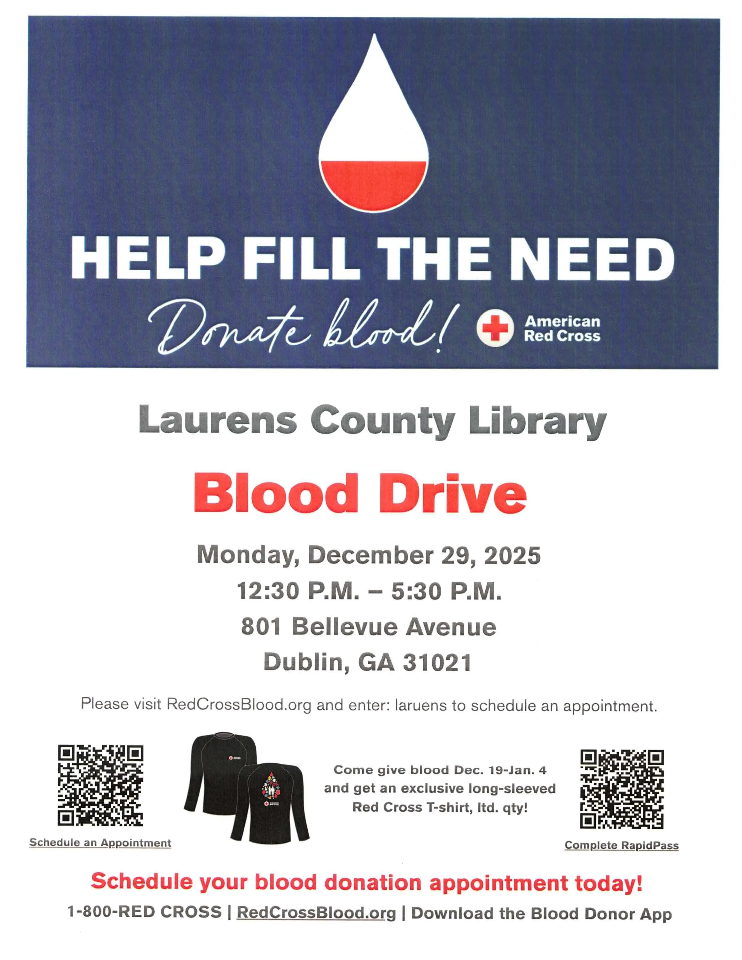 Help fill the need and donate blood! There will be an American Red Cross Blood Drive at Laurens County Library on Monday, December 29th from 12:30pm to 5:30pm.