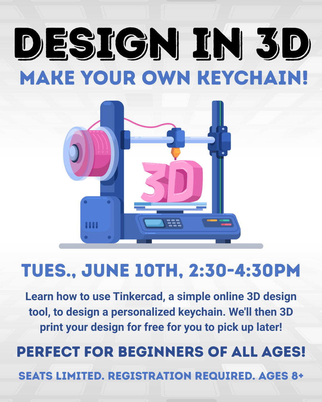 Learn how to use Tinkercad, a simple online 3D design tool, to create a personalized keychain. We’ll 3D print your creation for pickup after the program. Recommended for ages 8+. Perfect for beginners of all ages! Seats limited. Registration required.