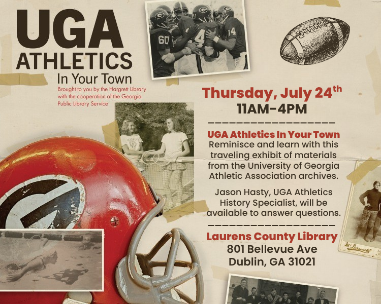 UGA Athletics In Your Town Thursday, July 24, 2025 11:00 AM 4:00 PM 11:00 16:00 Google Calendar ICS Reminisce and learn with this traveling exhibit of materials from the University of Georgia Athletic Association archives.Jason Hasty, UGA Athletics History Specialist, will be available toanswer questions.